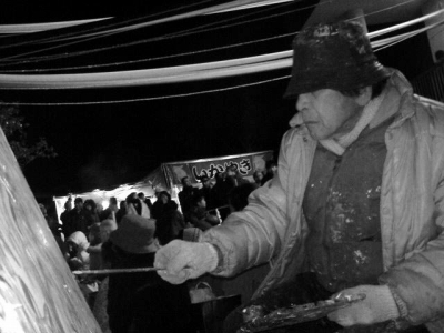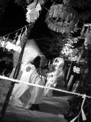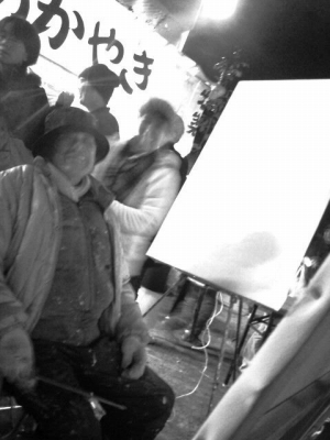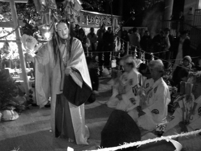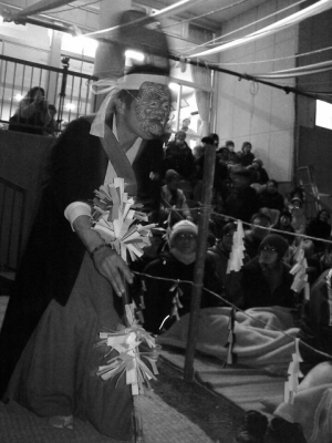 先日、宮崎県西米良村にある村所八幡神社に神楽を見に行ってきました。宮崎県では現在も村ごとにたくさんの神楽が残っていて、観光客向けに毎日行われている本場・高千穂の神楽や、激しい動きで人気の「銀鏡神楽」などが有名ですが、ここの「村所神楽」はゆったりほのぼのとした舞いが魅力で、600年の伝統を持つといわれています。さて、上で紹介した弥勒祐徳さんは40年にわたって各地の神楽を夜通し描き続けています。毎年、畳2枚分ほどの特大カンバスを持ち込み、ヤッケを着込んで、マタギさながらのかっこうで、一晩で一気に描き上げてしまいます。この日は、その弥勒さんとともに夜が明けるまで、飲んで笑って、大騒ぎでしたが、いまや弥勒さんは神楽とセットのような存在で、「あぁ弥勒先生。やっぱりいた。いっしょに写真撮ってください」などと、その人柄は観光客の人気の的なのでした。【石風社・藤村 記】