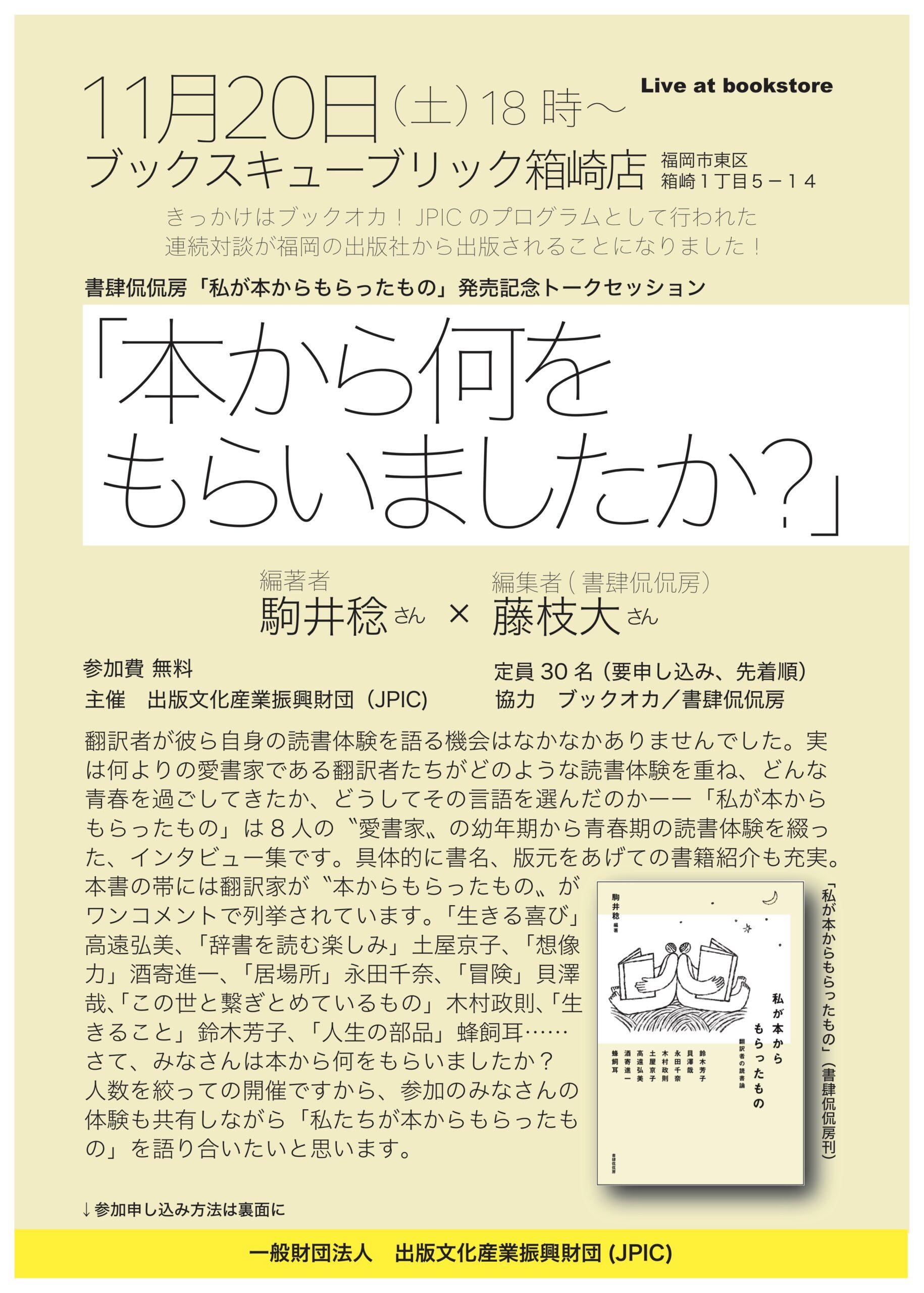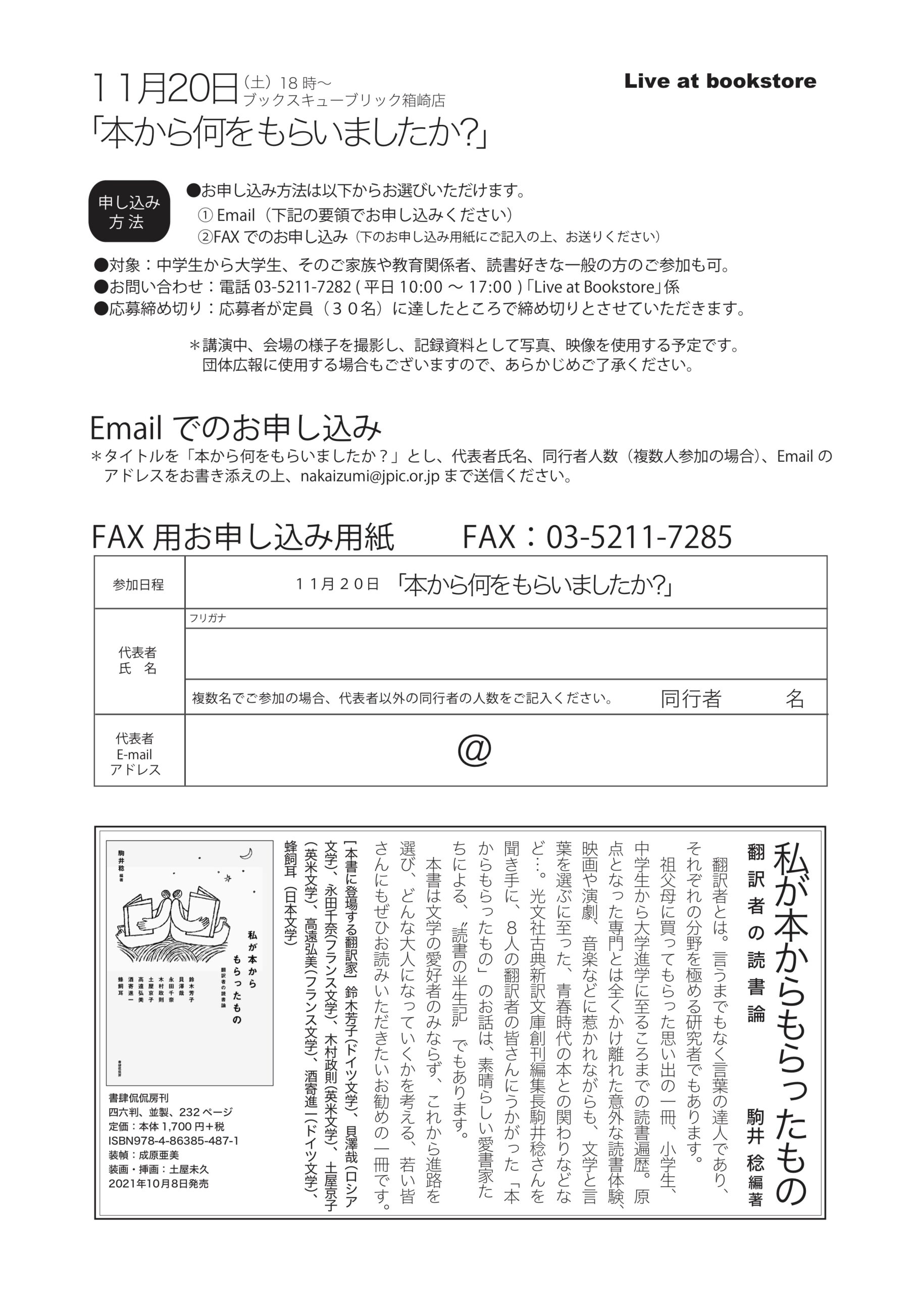 | 予約 | ●お申し込み方法は以下からお選びいただけます。 ※応募者が定員(30名)に達したところで締め切りとさせていただきます。 1)Email(下記の要領でお申し込みください) ▶タイトルを「本から何をもらいましたか?」とし、代表者氏名、同行者人数(複数人参加の場合)、Email のアドレスをお書き添えの上、nakaizumi@jpic.or.jp まで送信ください。 2)FAX でのお申し込み ▶お申し込み用紙にご記入の上、FAX:03-5211-7285までお送りください。 |