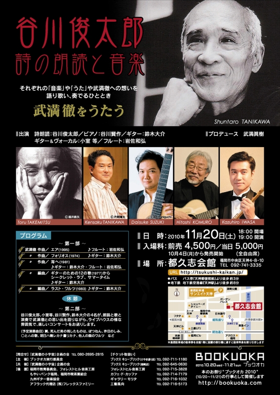 谷川俊太郎、小室等、谷川賢作、鈴木大介の4名が朗読と歌と演奏で武満徹との思い出を語りながら、ライブハウスのような雰囲気で楽しいコンサートをおおくりします。