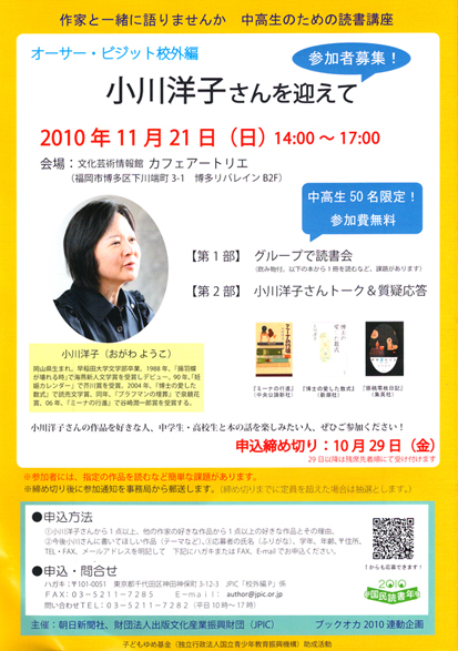 作家が学校を訪ねて「授業」をするオーサー・ビジットの特別版「中高生のための読書講座 オーサー・ビジット校外編」。講師は小説『博士の愛した数式』などで人気の小川洋子さんです。無料。中高生50人(抽選)の参加を募っています。小川さんと会えるめったにないチャンスです。中高生諸君、ぜひチャレンジしよう!(参加者には課題があります)。