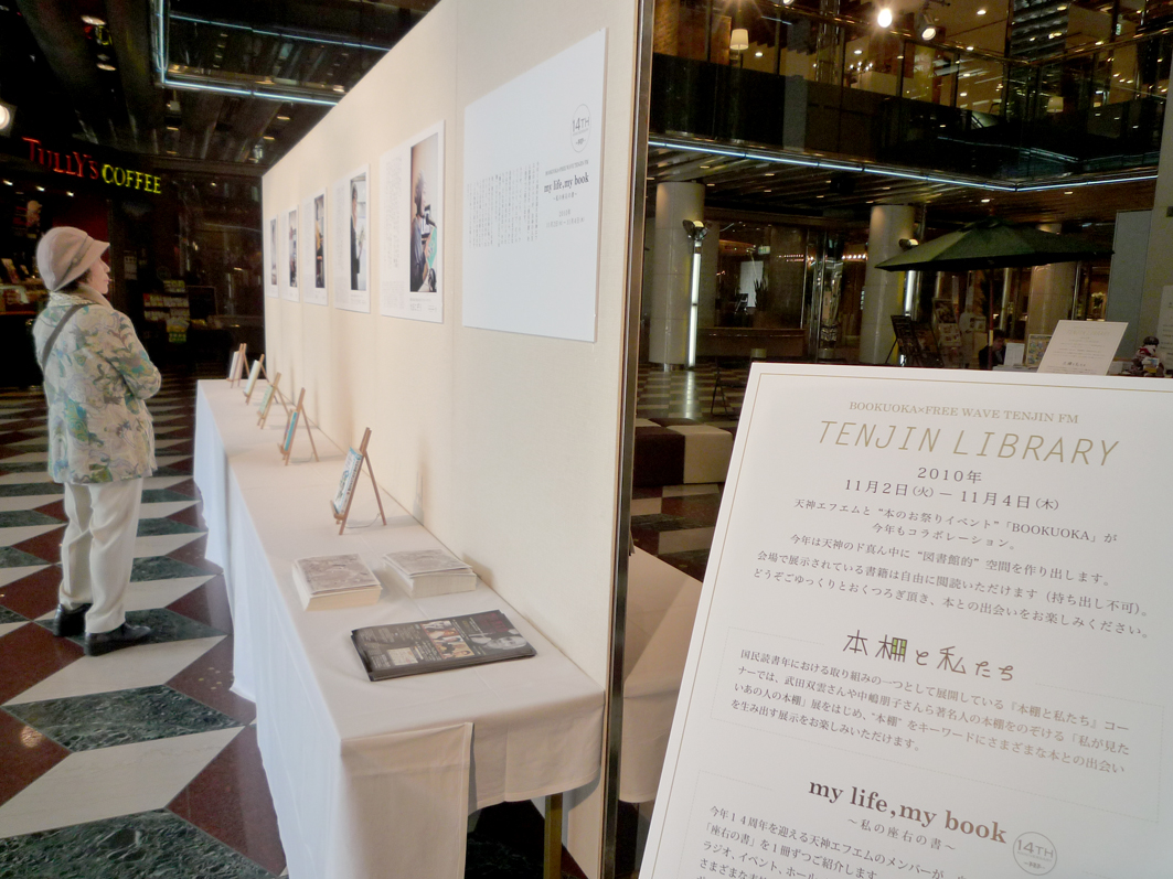 まず[TENJIN LIBRARY]は、ここ5年の天神エフエム企画としては一番の力作。エフエム関係者たちの選んだ座右の一冊を、入魂のコメント+写真で展示しています(担当・三好さん、おつかれさま)。